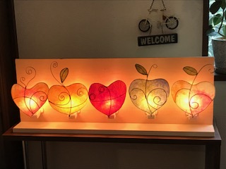 自宅の玄関に飾ると、柔らかい光を灯してくれて何とか可愛いライトに~。