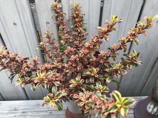 葉に光沢があり、ややピンク色の斑入り。