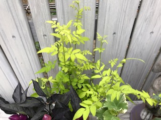 色鮮やかなライム色の葉が寄せ植えを引き立ててくれます。