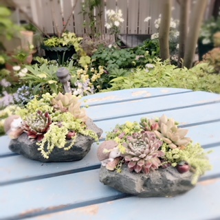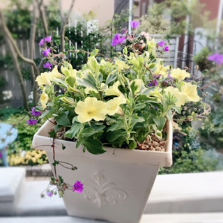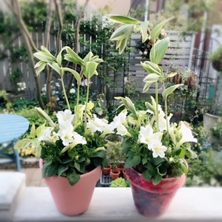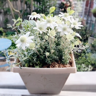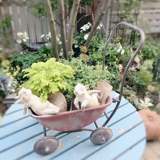 ブリキの花ぐるまに、ロベリアとマトリカリアの寄せ植え♪