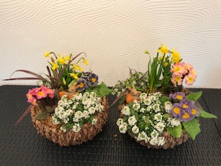大きいかごには、ミニ水仙を入れてひと足早い春の寄せ植えに~