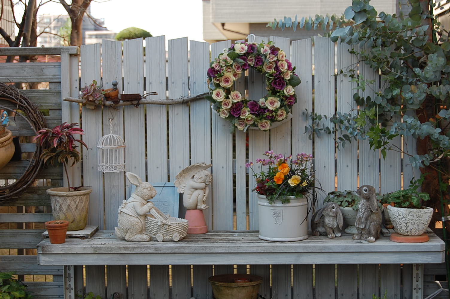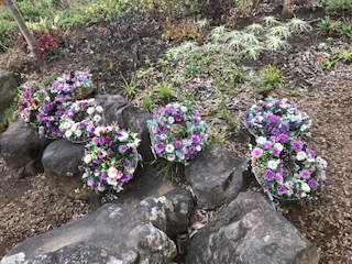 私は、ビオラを使わずに、葉牡丹・アリッサム・アイビー・シロタエのみのリースにしました。