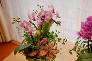 ミニ胡蝶蘭と観葉植物のブリコラージュフラワー♪