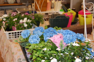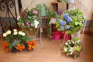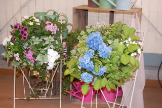 紫陽花のハンギングバスケットやニチニチ草・ペンタスのハンギングバスケット