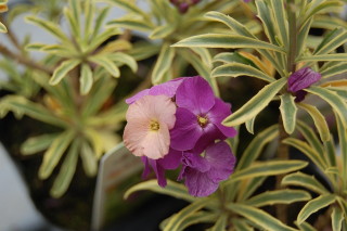 クリーム色斑が入って葉も花も楽しめるエリシマムの一種