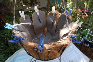 ヤシマットがずれない様に洗濯バサミでしっかり押さえ植え込んでいきます(^O^)