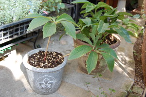 ふかふかの草花培養土に赤玉・鹿沼土を少々混ぜ、鉢底にはちょっと炭を入れて~