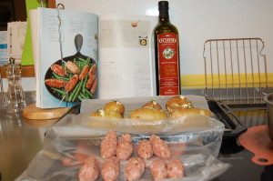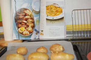 オーブンで焼いたポテトにカリカリガーリックをかけます♪