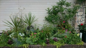 大きなプラスチック製の鉢をかなり深く埋め込んで、自然な感じで植物を植え込んでありました。