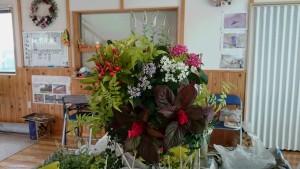 (左)ピンク色のケイトウを使いフィオラナ・サンライズの葉を上手く使い、動きのある作品です(^ ^)