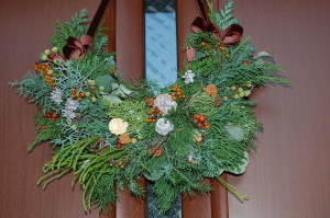 心のなかで、しっかり、ワイヤーでくくりつけないとスワッグの形がイビツになるんだな~と思いました。