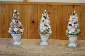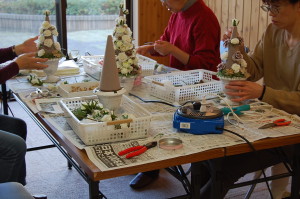 三角ツリーに仕上げる為のちょっとしたポイントをご説明して、花材と木ノ実を付けていきます。