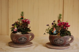 午前中は、ティーカップ寄せ植えレッスン。