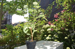 パーゴラ下のアナベルは、たった1本のポット苗を植えた後、翌年は挿し木育てたアナベルも植えたもの。