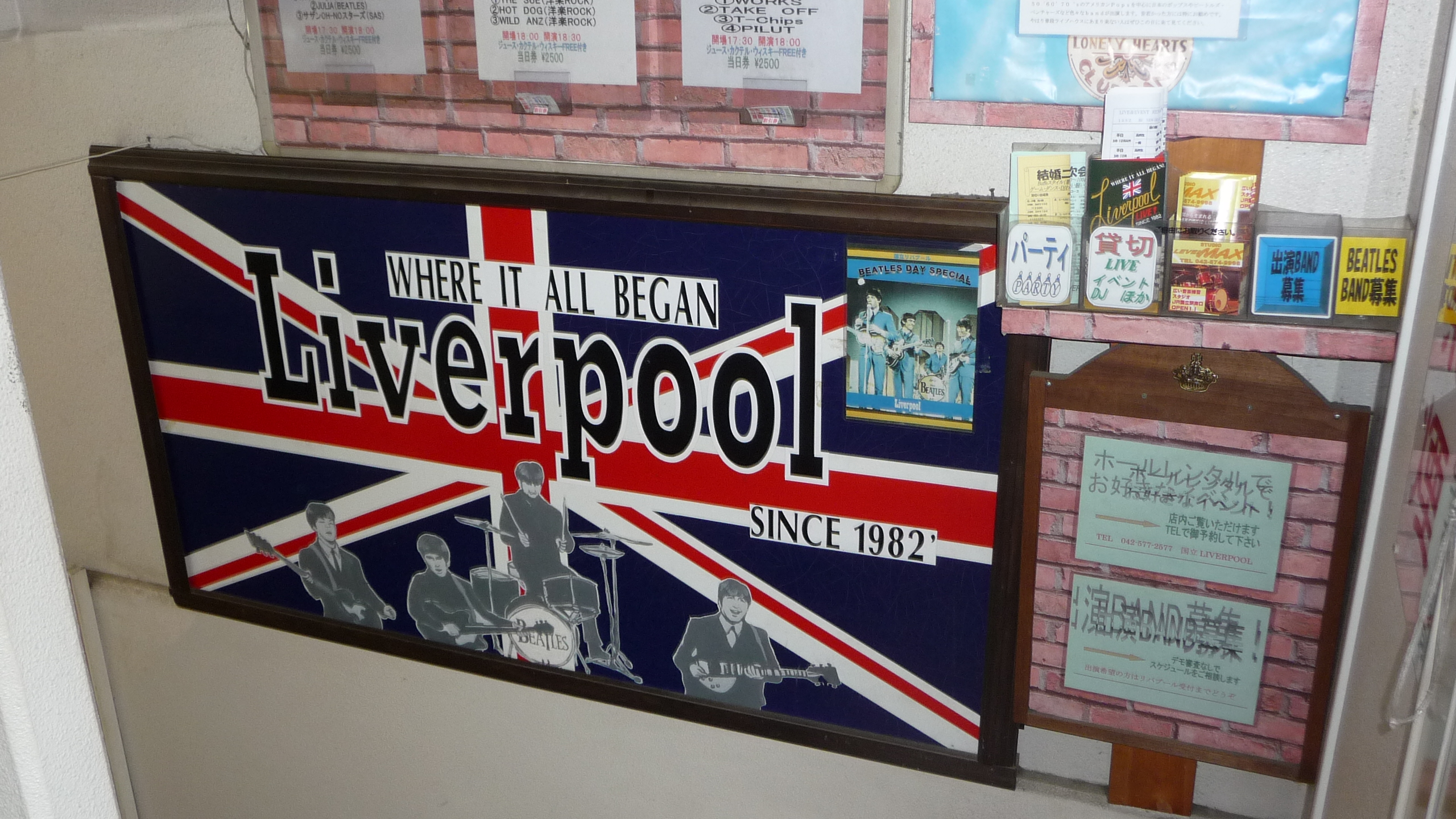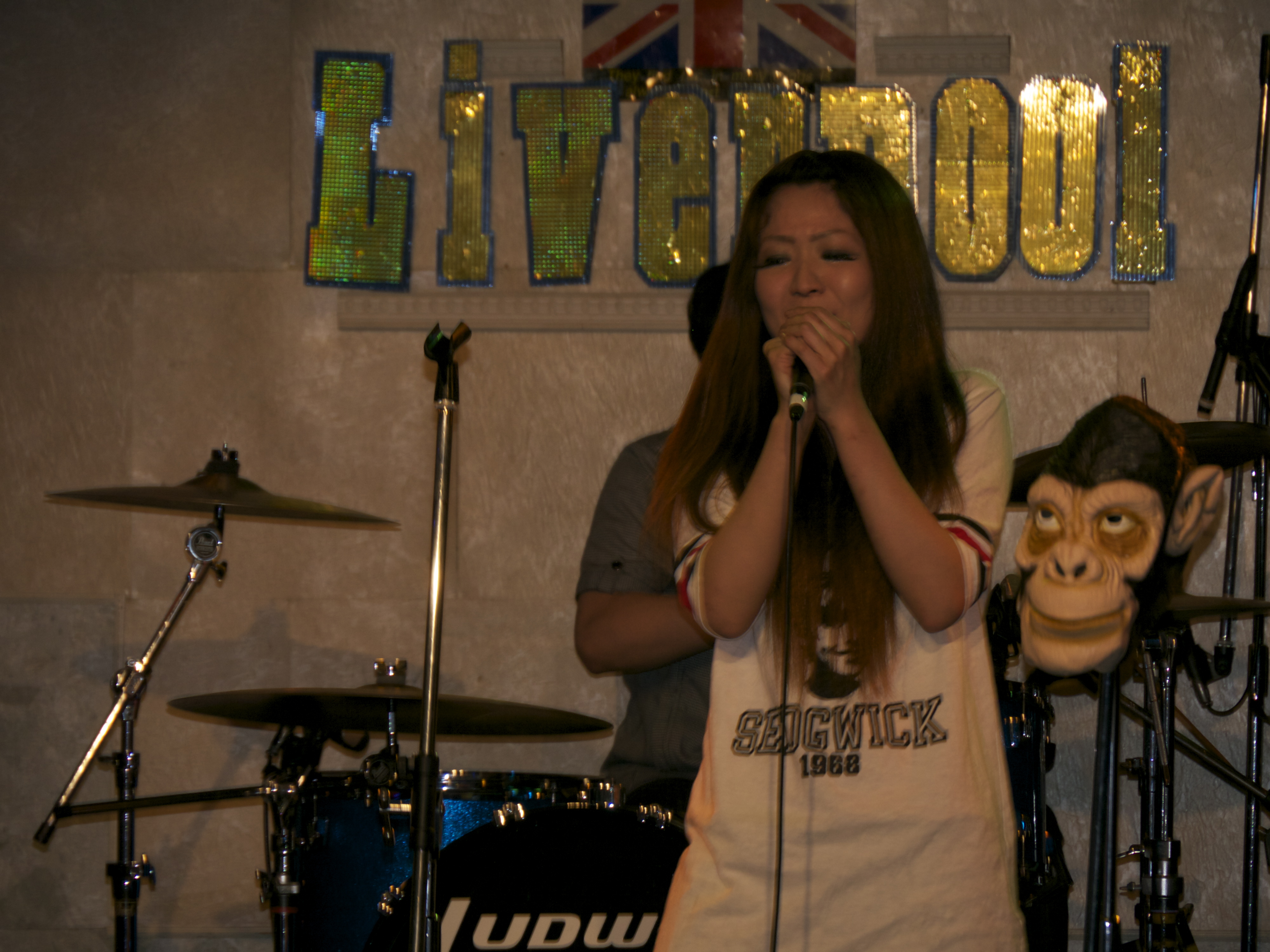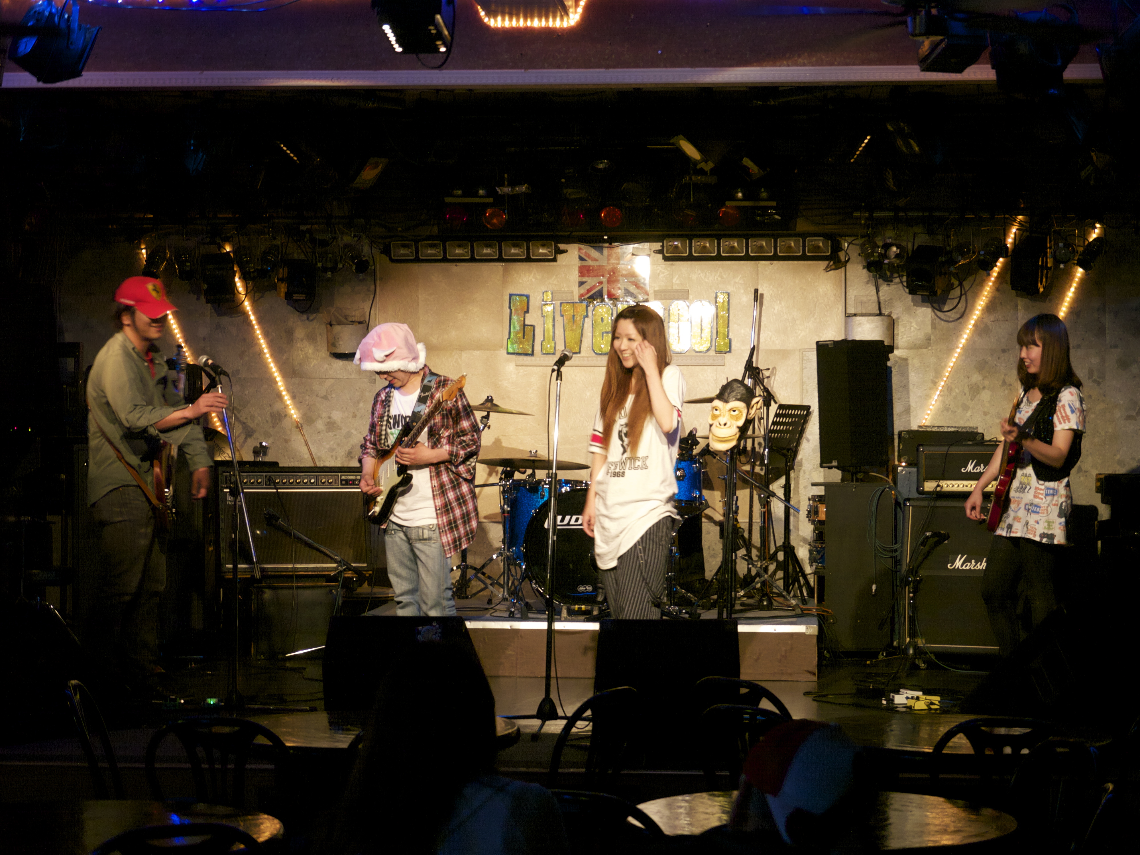 受講生小川さんのやっているバンド”C-an”のライブが6月4日(土)、国立でありました。当日はいい天気だったので、自転車で国立まで行き、近所を走り回ったが落ち着いたいいところです。国立駅南口に自転車を置き、徒歩5分ほど行った紀伊国屋スーパーの一つ先のビルの地下にLiverpoolという英国パブ風のライブ会場がありました。風圧で重たいドアを開けるとチケットカウンターがあり、事前にもらっていた入場チケットを渡し、ドリンク代600円を払い入場ドアを開け会場内へ。